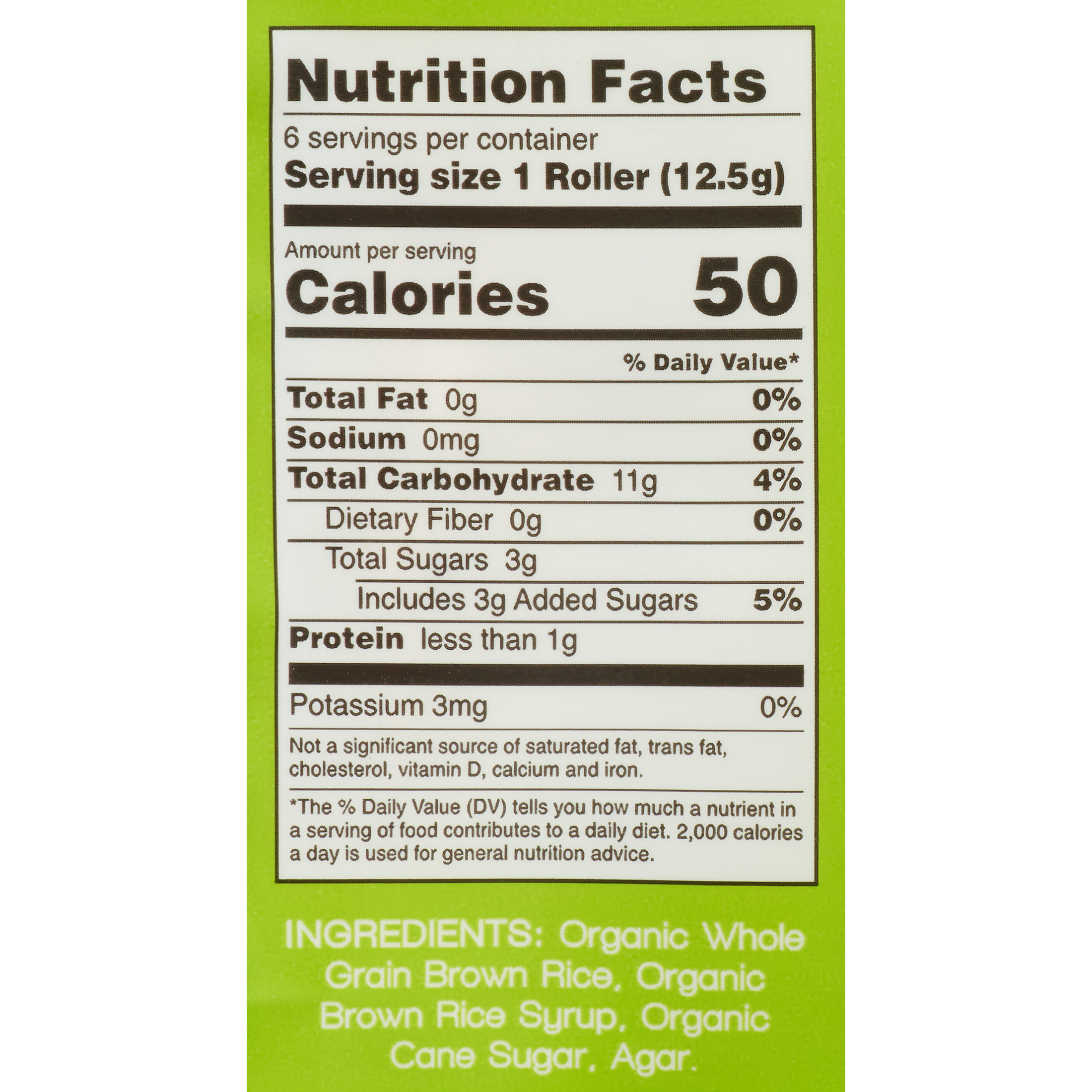 Snack freely with Crunchy Rice Rollers USDA Organic School Safe NON-GMO Gluten-free Vegan Kosher and Allergen free. The Daily Value DV tells you how much a nutrient in a serving of food contributes to a daily diet. 2000 calories a day is used for general nutrition advice.