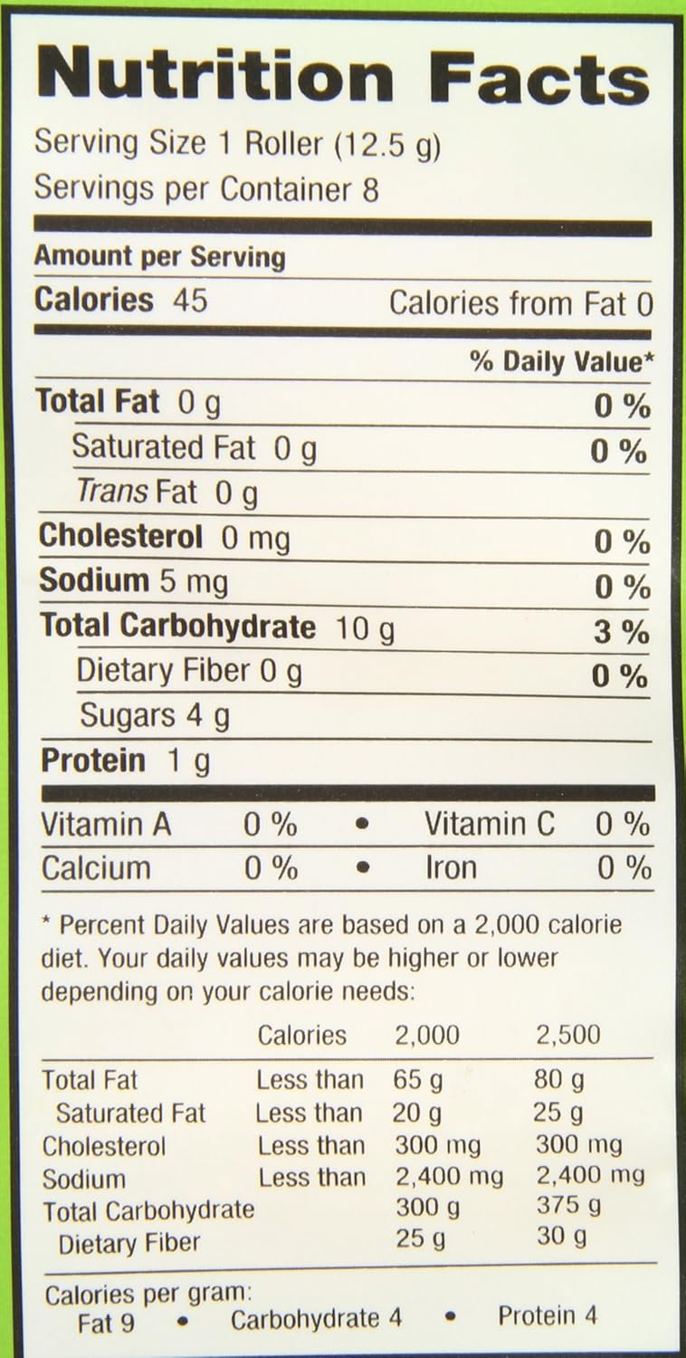 2000 calories a day is used for general nutrition advice. The latter is 24 g sugar and 0 g of dietary fiber the rest is complex carbohydrate. 1 Roller 125g Amount per Serving My Daily Value Calories 50 Kcal 3 Total Fat 0 g 0 Saturated Fat 0 g 0 Trans Fat 0 g 0 Cholesterol 0 mg 0 Sodium 0 mg 0 Potassium 3 mg 0 Total Carbohydrate 11 g 5 Dietary Fiber 0 g 0 Sugars 3 g 4 Added Sugars 3 g 12 Protein 0 g 0.
